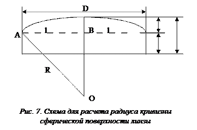 Отсюда следует, что для измерения показателя преломления стекла линзы необходимо измерить радиус кривизны сферической поверхности и ее фокусное расстояние. Радиус кривизны сферической поверхности линзы можно рассчитать, проведя измерения геометрических размеров линзы: ее толщины Н, диаметра D и толщины цилиндрического слоя h0 (рис. 7). Для треугольника АОВ имеем:
