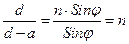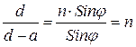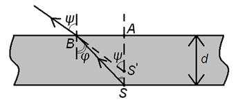 Рассмотрим ход луча SB (см. рисунок), направленного под малым углом φ к нормали. Преломившись в точке B, он выходит в воздух под углом ψ, определяемым из уравнения