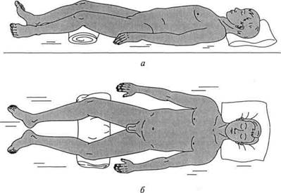 Рис. 18. Положение больного при переломе таза (по Волковичу): а — вид сбоку; б — вид сверху сближены. Под колени подкладывают валик (рис. 18). Постельный режим соблюдают в течение 4 — 5 нед; применяется ЛФК. Трудоспособность восстанавливается через 10—12 нед. Переломы с нарушением непрерывности тазового кольца. Это тяжелые переломы, часто сопровождающиеся шоком и повреждением тазовых органов. Как правило, возникают при сдавлении таза или падении со значительной высоты. Разрыв симфиза может быть также результатом родовой травмы. Симптомы: боли в тазовой области и промежности, усиливающиеся при движении ногами; вынужденное положение — «положение лягушки». Симптом «прилипшей пятки» резко положителен. Место перелома уточняется рентгенологически. Лечение: при переломах без смещения больного укладывают на щит в «положение лягушки» на 5 —6 нед (см. рис. 18). Проводят занятия ЛФК, физиотерапию. Если перелом со смещением, то применяют дополнительное скелетное вытяжение по оси бедра. При разрыве симфиза проводят лечение на гамаке. Хирургическое лечение симфиза показано при наличии статических нарушений в виде «утиной походки». Лобковые кости фиксируют циркулярным проволочным швом, лавсановыми лентами и металлическими пластинами. Затем в течение 6 нед проводят лечение на гамаке.