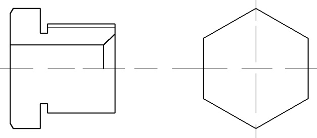 Многоугольники. Команда служит для построения равносторонних многоугольников практически с любым количеством граней. Нажмите на кнопку Многоугольник на правой панели инструментов. В командной строке отобразится сообщение _polygon Число сторон <4>:. Введите число сторон равное 6. Теперь укажите центр многоугольника на перекрестии прямых, используя объектную привязку. Далее в командной строке отобразится сообщение Задайте опцию размещения [Вписанный в окружность/ Описанный вокруг окружности] <В>:. Нам необходимо начертить штуцер под ключ на 14 мм, поэтому выберем вариант, Описанный вокруг окружности и введём радиус окружности, равный 7 мм. Поворот. С помощью этой команды можно поворачивать объекты на произвольный угол вокруг любой точки. Поворот происходит против часовой стрелки. Для того чтобы поворот происходил по часовой стрелке, необходимо вводить значение со знаком минус. Нажмите кнопку Повернуть она находится на правой панели инструментов. Выберите многоугольник, укажите базовую точку в центре шестиугольника, затем - угол поворота, равный 30° (рис. 5.2,а). Продолжим построение, начертив три горизонтальных линии на расстоянии 3,15 и 6 мм от горизонтальной оси (половина размера 6,3 и 12 мм) и прямую, проходящую через вершину шестиугольника. Для этого воспользуйтесь приемом Копирование на заданное расстояние, рассмотренным раннее, а третью прямую проведите с использованием объектной привязки. Установите линию Основная 06, включите команду рисования отрезков и, используя режим рисования Шаг, начертите правую часть штуцера (рис. 5.2,б). Фаска. Эта команда служит для формирования фаски под любым углом в месте пересечения двух линий. Эти линии могут заканчиваться в вершине угла, заходить или не доходить до неё. Режимы вычерчивания позволяют удалять либо оставлять исходные отрезки. Фаска задаётся линейными размерами катетов или величиной одного катета и угла. Включите режим ввода фаски, нажав соответствующую кнопку на правой панели инструментов. В командной строке отобразится текст: Выберите первый отрезок или [оТменить/полИлиния/Длина/Угол/Обрезка /Метод/ Несколько]:. Теперь нужно выбрать параметры ввода фаски из имеющихся вариантов. Введем букву д для того, чтобы выбрать режим ввода двух длин фасок. Укажем длину 1,5 мм, и выберем два отрезка справой стороны левой части чертежа. После этого воспользуйтесь командами удлинить и отрезок для того, чтобы достроить недостающие линии. Чтобы нарисовать вторую фаску вновь включите режим ввода фасок, но теперь нажмите букву у для того, чтобы указать размер одной стороны фаски и угол наклона. Введите размер 0,7 мм, а угол 30° (рис. 5.2,в). Теперь воспользуйтесь командой Зеркальное отражение и начертите вторую часть штуцера, после этого удалите лишние линии, начертите тонкую линию резьбы и осевые линии (рис. 5.2,г). Затем постройте остальные линии, а также дополнительную, после чего короткую основную (рис. 5.3,а). Далее начертите дугу, используя соответствующую команду (рис. 5.3,б).