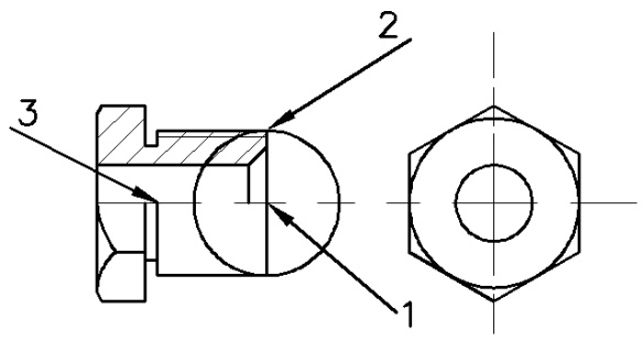 Программа AutoCAD имеет средства создания объёмных моделей, которые позволяют увидеть созданную деталь в натуральном виде, имея возможность рассмотреть его с любой точки с различными вариантами подсветки и даже с перспективным искажением, максимально соответствуя действительному виду. Существует два возможных варианта объёмного моделирования. Первый - от чертежа к модели, или от плоского изображения к объёмному образцу. Второй - когда, используя различные объёмные элементы, формируется изделие, которое в дальнейшем может быть представлено в виде плоских видов и сечений. Для работы с объёмными моделями можно использовать рабочее пространство классического вида программы, но для большего удобства необходимо переключиться в рабочее пространство, специально адаптированное для этих целей. Для этого нажмите кнопку Переключение рабочих пространств, находящуюся в правом нижнем углу, и выберите пункт 3D моделирование. Рассмотрим приёмы создания объёмных моделей на примере создания штуцера из имеющегося двухмерного чертежа. Откройте готовый чертёж штуцера, удалите размеры, создайте ещё один слой для построения объемных элементов и сохраните получившейся чертеж, дабы не изменить уже имеющийся. Цилиндр. Начнём создание чертежа с построения цилиндра. Нажмите на кнопку Цилиндр. В командной строке отобразится сообщение: Центр основания или [3Т/2Т/ККР/ Эллиптический]:. Программа предлагает указать центр окружности, являющейся основанием цилиндра, и при этом предполагается, что плоскость, находящаяся на рабочем поле, совпадает с плоскостью основания цилиндра. То есть нижняя плоская поверхность цилиндра (фактически окружность) лежит в плоскости вашего чертежа. Теперь критически посмотрим на наш исходный чертёж. Главный вид его имеет горизонтальную ось, а значит, цилиндры, образующие штуцер, должны здесь лежать горизонтально. А вот вид, расположенный справа, соответствует ориентации создаваемых цилиндров, и именно на этом виде нужно формировать цилиндры. Но здесь, кроме отверстия, других цилиндров не видно, а поэтому строить (создавать) их практически невозможно. Поэтому цилиндры мы будем создавать на тех проекциях, где они видны (показаны) и где имеется информация об их размерах, предполагая, что в дальнейшем мы изменим их пространственную ориентацию и положение. Начнём работу на правой проекции и создадим цилиндрическую поверхность (цилиндр), образующую отверстие диаметром 6,3 мм, которое на данной проекции видно в натуральную величину. После нажатия на кнопку Цилиндр, включите привязку к центру, подведите указатель мыши к центру окружности и нажмите левую кнопку мыши, затем необходимо указать радиус основания окружности. С помощью соответствующей привязки укажите любую точку на окружности, обозначающей отверстие. После чего необходимо указать высоту цилиндра и нажать Enter. Напомним, что высота штуцера равна 14 мм. Но для тел, которые в последствии будут формировать отверстия, рекомендую указывать величины немного больше необходимых (в нашем случае укажем 60 мм). Фактически фигура создана, но её не видно. Если перейти на трёхмерный вид, то можно рассмотреть готовый цилиндр (об этом будет рассказано позднее). Повторите действия, но теперь центр цилиндра укажите в точке 1 на левом виде (рис. 6.1).