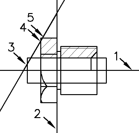 Конус. Рассмотрим построение некоторых тел на примере создания конуса. Он нам понадобится для формирования фаски на поверхности шестиугольника. Для начала сделайте слой, которому принадлежат все тела, невидимым, для того чтобы он не мешал дальнейшим построениям. Затем постройте две перпендикулярные прямые 1 и 2 (рис. 6.5,а), после чего проведите ещё одну прямую 3, указав две точки 4 и 5, означающие концы отрезка обозначающего фаску.