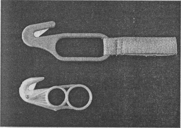 Рис. 62. Пищалки Skytronic (слева) и ProTrack (справа), установленные на шлемы Самые простые пищалки имеют механический регулятор установок без индикаторов (Little Angel, Dytter). Более современные недорогие модели управляются кнопками и оснащены светодиодными индикаторами установленных высот (Pro-Dytter, Vertex-Fly). Самые совершенные модели имеют жидкокристаллический экран, могут записывать во встроенную память данные о прыжках — высоту отделения и раскрытия, максимальную и среднюю скорость падения и другие параметры (Pro-Track, Neptun, Skytronic). Для большинства видов прыжков основным прибором, определяющим высоту в свободном падении, является высотомер, а звуковой сигнализатор — вспомогательным. Для фрифлая, где высотомером пользоваться затруднительно, пищалка — основное средство контроля высоты, и принято использовать сразу две штуки. СТРОПОРЕЗ Предназначен для отрезания строп, когда это необходимо для решения возникших проблем. Например, если при отказе основного парашюта его необходимо отцепить, а замок отцепки заклинило. Стропорез может понадобиться и при прыжках на принудительное раскрытие в случае зависания за самолетом или для освобождения от парашюта при зависании на дереве. Случаи, когда парашютист пользовался стропорезом при отказе основного парашюта, единичны, но тем не менее пока наличие у парашютиста стропореза является обязательным условием для допуска к прыжкам, исключение делается обычно только для перворазников. Стропорез представляет собой обоюдоострый нож с тупым концом (рис. 63). Обязательно используются жесткие ножны, не допускающие случайного пореза части парашютной системы. Рукоятка ножа-стропо-реза привязывается шнуром к какой-либо части парашютной системы, чтобы парашютист не потерял нож, если он случайно выпадет из рук или ножен. После использования стропореза в воздухе парашютисту полагается выбросить его, и, чтобы нож не болтался на веревке, мешая раскрытию запаски, его шнур привязывается к парашютной системе через не особо прочное звено, которое парашютист в состоянии порвать, часто для этого используют черную резинку. Стропорез для купольной акробатики — это обоюдоострый клинок с острым концом, позволяющий парашютисту, обмотанному куполами, выбраться наружу и воспользоваться запасным парашютом.