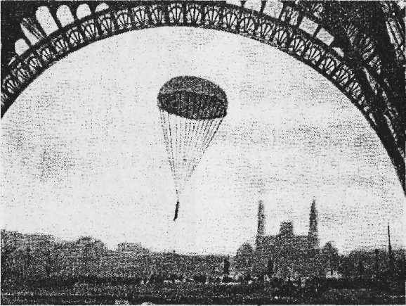 парашют. Изобретатель разбился, спрыгнув с верхней площадки памятника Победы в Берлине. В 1910—1914 гг. французы Эрве и Орс работали над парашютами для авиаторов. Свернутые купола парашютов закреплялись под самолетами, там же устраивались и сами парашютисты. Когда аэроплан поднимался на высоту, парашютисты прыгали так же, как ранее воздухоплаватели, выдергивая парашюты из-под самолетов. Чтобы облегчить купол, Эрве решил сшить его из трех разных материалов. Для средней части купола он взял самый тяжелый материал, у полюсного отверстия — более легкий, а для остальной части использовал самую легкую, но прочную из всех прорезиненных материй. Этот парашют он несколько раз испытывал в Париже, сбрасывая с Эйфелевой башни манекен весом 80 кг (рис. 112). Испытания оказались удачными,
