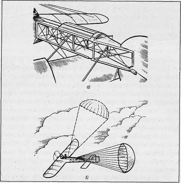Рис. 114. Авиационный парашют Бонне: а — парашют уложен в футляре; б.— крепление веревки парашюта к поясу летчика с расположенными на нем парашютом и куклой косом 76 кг. Купол раскрылся хорошо. Первый прыжок с парашютом принудительного действия из кабины самолета выполнил американский летчик А. Берри в марте 1912 г. с высоты около 500 м. В августе 1912 г. французский летчик Пегу испытал парашют Бонне в обстановке реального полета. Позднее его неоднократно испытывал Ле Бури. Но широкого распространения эта система не получила, поскольку была неудобна и довольно опасна: при раскрытии купол парашюта мог зацепиться за хвостовое оперение самолета. При пожаре, штопоре и ряде других случаев спасение летчика не гарантировалось. В России в 1911—1912 гг. работал над созданием удобного и надежного авиационного парашюта Г.Е. Котельников. Несмотря на хорошие результаты, показанные в испытаниях, военное ведомство не проявило должного интереса к парашюту. Примерно в это же время в Германии занимался разработкой парашюта авиационный инженер Отто Хейнике. Он создал его в 1913 г. Раскрытие купола производилось фалом, прикрепленным к фюзеляжу. Купол и стропы размещались в мешке, который ремнями крепился к летчику. В Англии выпускались подобные парашюты (тоже с принудительным раскрытием) конструкции Кальтропа. Во Франции в 1915 г. Жюкмесу удалось создать и испытать парашют, получивший признание и довольно активно использовавшийся на фронтах. Парашют системы «жюкмес» считался лучшим спасательным парашютом в годы Цервой мировой войны (рис. 115). В целом же размещение парашютов на первых самолетах и их крепление к летчикам были неудачные, число жертв авиакатастроф росло, а парашюты на самолетах широкого применения не находили. Даже во время Первой мировой войны летчики начали использовать парашюты только в конце 1916 г.