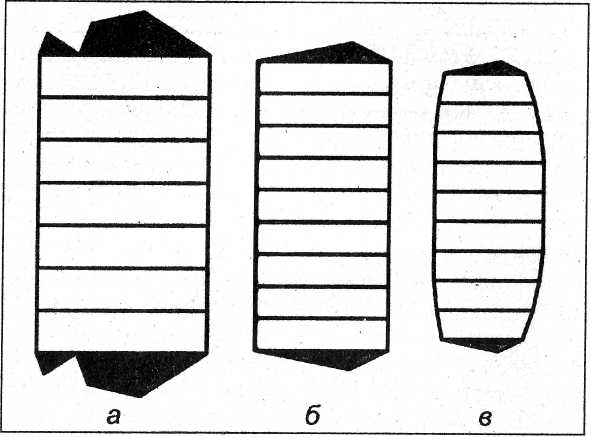 Рис. 28. Формы крыла, применяемые в парашютостроении (в скобках указывается значение aspect ratio): а — классический прямоугольный купол (1,8); б — скоростной прямоугольный купол (2,5); «— скоростной эллиптический купол (2,7)