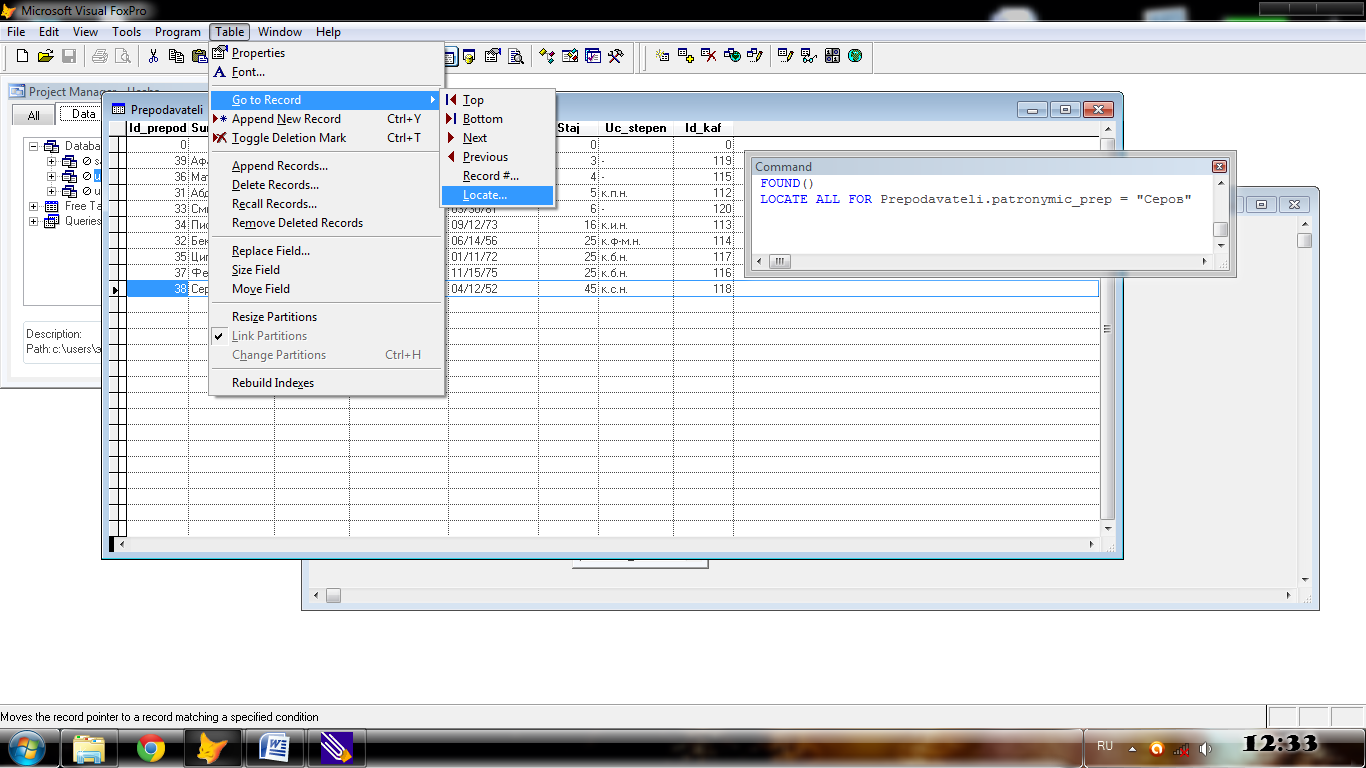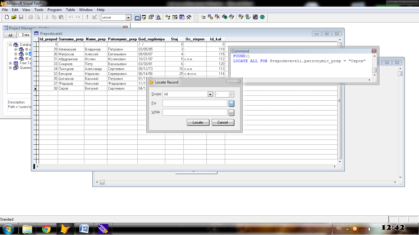 Тема: Поиск информации в базах данных. Установка фильтров. Ход работы: 1)Для того чтобы начать данную лабораторную работу необходимо открыть нужную таблицу, затем нажать на вкладку Locatе. Далее появится диалоговое окно: