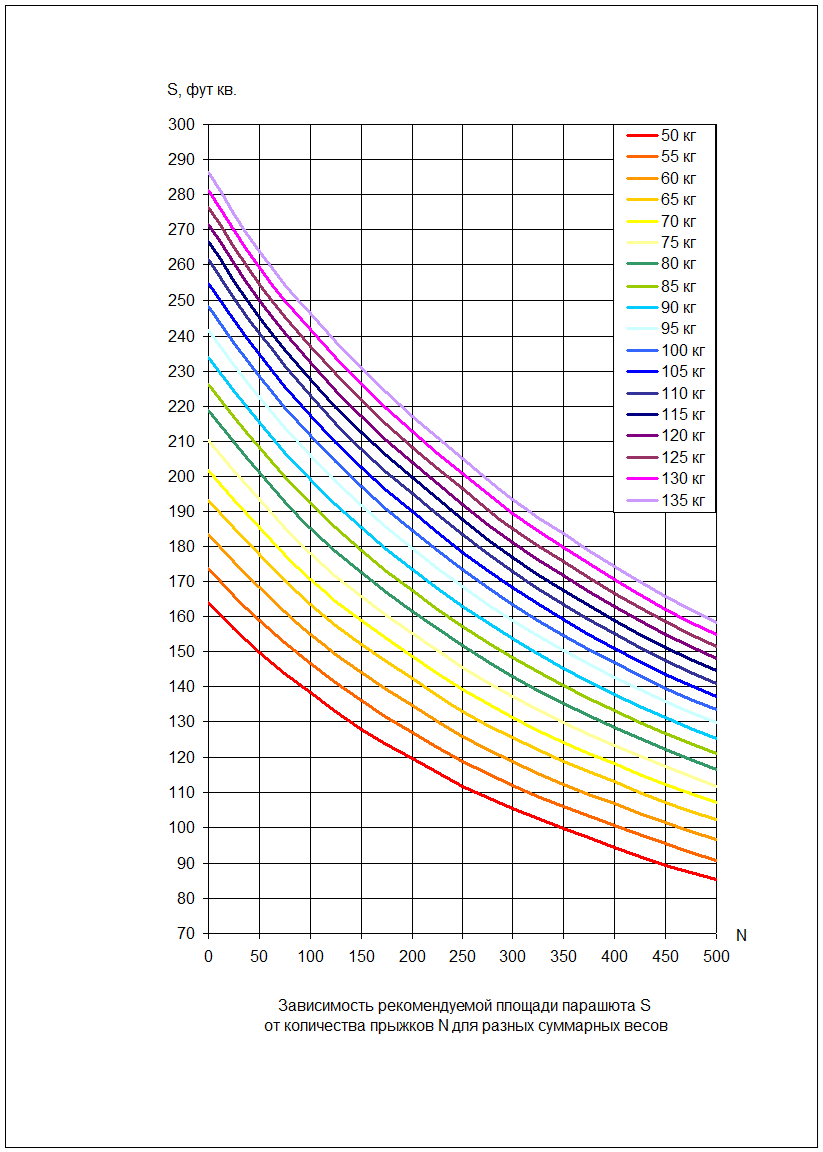 Таблица рекомендуемой площади парашюта в зависимости от количества прыжков N и суммарного веса