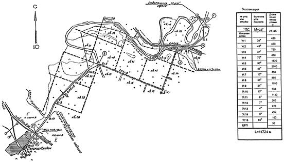 1. На участке от ПС "Горная" до угла 1 (горная местность) и от угла 5 до угла 6 (пойма р. Муса) изыскания трассы проводятся методом инструментального трассирования с полным объемом работ. 2. На участке от угла 3 до угла 5 изыскания трассы проводятся методом инструментального трассирования с сокращенным, объемом работ (местность не имеет четких ориентиров). 3. На участке от угла 1 до угла 2 (вдоль подземного трубопровода), от угла 2 до угла 3 (по просеке), от угла 6 до угла 10 (местность имеет четкие, постоянные ориентиры) и от угла 10 до н.п. "Репьевка" (вдоль линии связи и автодороги) изыскания трассы проводятся методом инструментального трассирования с сокращенным объемом. Приложение 9 Рекомендуемое План трассы ВЛ на основе планов землепользований