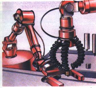 На выставке НТТМ-82 можно было видеть роботы, искусно манипулирующие электролампами (рис. 5). Кроме прочих весьма привлекательных достоинств один из роботов имел хитроумный захват в виде резиновых гофрированных хоботков. Когда в кисть подавали воздух, хоботки, раздуваясь, изгибались и захватывали лампу за тонкостенную стеклянную колбу с деликатной осторожностью, но прочно. Массу нежных присосок – пальцев используют для манипуляции мягкими изделиями, например шоколадными конфетами или диетическими яйцами. Различают руки роботов и по размерам: есть экземпляры рук для работы с многотонными валами, а есть миниатюрнейшие щипчики – пинцетики для изделий микроэлектроники или часовых шестерёнок. Некоторые пальчики – усики манипулируют деталями, различимыми лишь в микроскоп. Date: 2015-07-27; view: 547; Нарушение авторских прав |