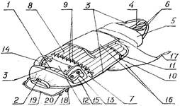 1-основа; 2-карабін; 3-стрічка ЛТКкрП-26-600; 4- запобіжник 5-стрічка з кільцем; 6-шнур-затягування Основа 1 камери стабілізуючого парашута (рис. 3), має циліндричну форму й виготовлена із тканини арт.56260 Кр пл. У верхній частині основи є причіпний карабін 2, за допомогою якого камера стабілізуючого парашута кріпиться в літаку (вертольоті). При здійсненні стрибків з літаків Ан-12, Ан-22, Ан-26, Ан-72, Ил-76 і вертольота Мі-8 камера стабілізуючого парашута кріпиться безпосередньо за трос або спеціальне пристосування в літаку або вертольоті. При здійсненні стрибків з літака Ан-2 і вертольоти Мі-6 причіпний карабін камери стабілізуючого парашута кріпиться за сергу перехідної ланки довжиною 1 м. Причіпний карабін 2 кріпиться до камери стабілізуючого парашута за допомогою стрічки ЛТКкрП-26-600. У вушко причіпного карабіна 2 пропущена й застрочена зиґзаґоподібним рядком стрічка зачековки 7 із ЛТКкрП-26-600, для зачековки гумової соти, змонтованої на ранці. На стрічку 3 і верхню частину основи 1 нашитий запобіжник 4 із тканини арт.56260 Кр пл., окантований стрічкою ЛТКкрП-20-150. У нижній частині камери стабілізуючого парашута діаметрально протилежно нашиті чотири петлі 5 зі стрічки ЛТКкрП-20-150 з кільцями для контровки їх з кільцями стабілізатора стабілізуючого парашута. Для затягування верхньої основи камери в підгибку основи 1 вставлений шнур 6 ШКП-150. Довжина камери стабілізуючого парашута (у складеному виді) 0,30 м, ширина -0,19 м. Маса камери стабілізуючого парашута 0,16 кг.
