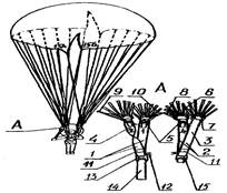 Парашут 83 м2 з ланками підвіски Парашут 83 м2 (основний парашут) призначений для безпечного зниження й приземлення парашутиста. Основний парашут (рис. 6), складається з купола й строп, змонтованих на дві ланки підвіски. Купол основного парашута, має основу у формі кола діаметром 10,4 м, площею 83 кв.м, що складається із чотирьох секторів 1 і накладки 2, що нашита в центрі купола. Кожен сектор виготовлений із тканини арт.56011П. Накладка виготовлена із тканини арт.56006 П. Сектора купола з'єднуються між собою швом у замок. На шви, що з'єднують сектори купола, настрочені підсилювальні стрічки ЛТКП-13-70. Нижня кромка купола утворена підгибом тканини на зовнішню сторону й посилена настроченої на неї із двох сторін стрічкою ЛТКП-15-185. Для збільшення міцності купола з його зовнішньої сторони настрочені стрічки ЛТКП-13-70, які, перетинаючись, утворять на його поверхні каркас 3, а у нижньої кромки - тридцять петель 4 для кріплення строп. Ліворуч від петель 4 на куполі проставлені порядкові номери строп. Між стропою 1А и стропою 28 на зовнішній стороні купола нанесене заводське маркування. По нижній кромці купола біля всіх строп, крім строп 1А, 1Б, 15А и 15Б нашиті стягуючі стрічки 10 ЛТКП-15-185 для зменшення часу наповнення купола й зменшення ймовірності його перехльостування стропами. На полюсну частину купола нашита вуздечка 11 зі стрічок ЛТКП-26-600, призначена для приєднання петлі ланки стабілізуючого парашута. На основі купола, між стропами 1А и 1Б, 15А и 15Б є щілини довжиною 1,6 м, що починаються від нижньої кромки куполи й призначені для розвороту куполи при зниженні. Стропи основного парашута в кількості 30 шт. одним кінцем прив'язані до петель купола, іншим - до пряжок-півкілець правого 1 і лівого 2 ланок підвіски (рис. 7). Кінці строп застрочені зиґзаґоподібним рядком. Двадцять сім строп виготовлені зі шнура ШКП-150, а три 1А, 1Б и 28 - зі шнура ШКПкр-190 зеленого кольору. Дня полегшення укладки основного парашута на стропі 14 у нижньої кромці купола й у пряжок-півкілець ланок підвіски нашиті розпізнавальні муфти жовтогарячого цвіту. На відстані 0,2 м від нижньої кромки купола й 0,4 м від пряжок-півкілець ланок підвіски на всіх стропах нанесені мітки, що вказують на початок і кінець їхнього укладки в камеру основного парашута. Довжина строп у вільному стані від нижньої кромки купола до пряжок-півкілець ланок підвіски дорівнює 9,0 м. На стропи 1А и 15 А, 1Б и 15Б нашиті ліва 3 і права 4 стропи керування, призначені для розвороту куполи й виготовлені зі шнура ШКПкр-190 (червоного кольору) у два складення. Стропи керування просмикнуті через кільця 5, що нашиті із внутрішньої сторони ланок підвіски. Ліва стропа керування одним кінцем пристрочена до стропі 15А на відстані 1,45 м від пряжок-півкілець 7 ланок підвіски, а другим - до стропі 1А на відстані 1,25 м від пряжок-півкілець ланок підвіски. Права стропа керування одним кінцем пристрочена до стропі 15Б на відстані 1,45 м від пряжок-півкілець ланок підвіски, а другим - до стропі 1Б на відстані 1,25 м від пряжок-півкілець ланок підвіски. При натягу лівої стропи керування натягаються стропи 1А и 15А, втягуючи усередину нижню кромку купола так, що відбувається розворот купола вліво. При натягу правої стропи керування натягаються стропи 1Б и 15Б, втягуючи усередину нижню кромку купола так, що відбувається розворот купола вправо. Причиною розвороту в обох випадках
