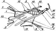 1-основа; 2-кільце; 3-стрічка; 4-вуздечка; 5-косинка; 6-шнур; 7-посилення;8-стільника; 9-стрічка; 10-розподільник стільник; 11-гума стільник; 12-клапан; 13-люверс; 14-ліва кишеня; 15-права кишеня; 16-фартух; 17-стрічка-зав'язка; 18-знімна стільника; 19-фартух; 20-знімна сота У підгибку нижньої частини камери основного парашута вставлене кільце 2 з еластичної стрічки шириною 0,029 м для забезпечення впорядкованого виходу купола основного парашута. Поверхня камери основного парашута посилена стрічкою 3 ЛТКкрП-25-200, що йде по периметрі нижньої основи камери й двома стрічками ЛТКкрП-26-600, що утворять у верхній частині камери вуздечку 4. Дня зручності укладки купола основного парашута в камеру по її верхній основі й стрічкам вуздечки нашита косинка 5 із тканини арт.56023 Крп. У підгибку верхньої основи камери вкладений і закріплений шнур 6 зі ШКП-150, призначений для стягування верхньої підстави камери. На основі камери нашиті: а) посилення 7 із тканини арт.56023 Крп; б) одинадцять стільник 8 із тканини арт.56023 КрП для укладки строп основного парашута (для зручності укладки в нижній частині стільник нашиті стрічки 9, виготовлені із ЛТКкрП-20-150); в) розподільник стільник 10, що складається зі стрічки ЛТКкрП-40-700 і петель зі шнура ШХБ-125, у які вставлена гума 11 зі шнура ШРкр і призначена для втримання строп основного парашута в стільниках камери; г) клапан 12 із тканини арт.56023 КрП із двома парами люверсів 13 для пропущення знімних гумових стільник і двома кишенями (лівим 14 і правим 15) для прикриття пучків строп основного парашута, просмикнутих у знімні гумові стільники); д) фартухи 16 із тканини арт.56004 КрП зі стрічками-зав'язками 17 ЛТКкрП-20-150 для прикриття пучків строп, покладених у стільники. На нижній частині основи камери встановлені два знімні парашутні стільники 18 і нашитий фартух 19 із двома знімними парашутними стільниками 20. Пучки строп основного парашута, просмикнуті в знімні парашутні стільники, пропущені через люверси клапана 12, зачековують камеру, запобігаючи передчасному виходу з її купола основного парашута. Для зручності укладки строп на клапані 12 біля люверсів нанесене маркування у вигляді цифр 1, 2, 3, 4. Довжина основи камери в складеному виді 0,735 м, ширина -0,387 м., маса камери - 0,4 кг.