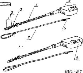 Ланка ручного розкриття Ланка ручного розкриття (рис. 10) призначена для розкриття двухконусного замка парашутистом. Ланка ручного розкриття конструктивно може бути виконане без поліетиленової оболонки й з нею. Воно складається з кільця 1, троса 3, обмежника 2 і петлі 5. Кільце виготовлене зі сталевого прутка. Зовнішня частина кільця, що виходить із кишені, пофарбована в червоний цвіт. Для втримання кільця в кишені по обидва боки кільця є западини. Трос довжиною 0,6 м виготовлений зі сталевого каната, один кінець якого має обмежник, а іншої дротову петлю. Трос на відстані 0,21 м від обмежника й 0,057 м від петлі покритий поліетиленовою оболонкою. Маса ланки ручного розкриття - 0,200 кг.