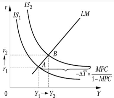 Модель IS-LM позволяет исследовать процесс взаимодействия рынков товаров и денег в результате использования фискальных или денежно-кредитных инструментов макроэкономического регулирования. Мероприятия фискальной политики направлены на рынок товаров, при этом подразумевается воздействие государства на экономическую конъюнктуру посредством изменения Gи налогообложения. Допустим, гос-во сокращает налоги на величину ΔТ. Тогда, кривая IS смещается вправо на расстояние, равное: