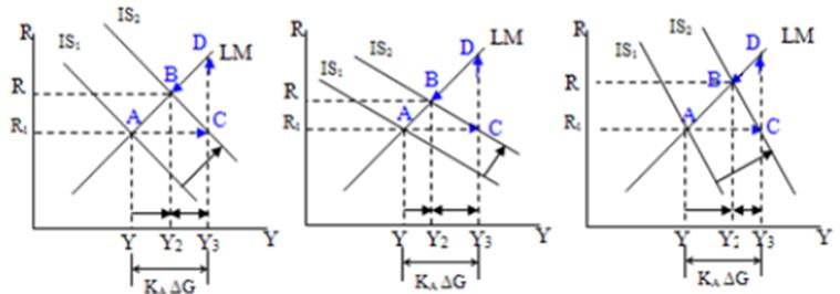 Теперь допустим, что гос-во увеличивает гос-ые расходы на ΔG. (см рис 2).В этом случае кривая IS сдвигается вправо на расстояние, равное: ∆ G * (1 \ (1-MPC)), где ΔG - увеличение гос-ых расходов; (1\ (1-MPC)) - мультипликатор гос-ых расходов. Равновесие перемещается из точки А в точку В, так как ставка процента возрастает с r1 до r2, а доход ув-ся с Y1 до Y2. Доход возрастает через мультипликационный эффект на: ∆G/(1 - MPC).Поэтому кривая IS сдвигается вправо на расстояние, равное этой величине.