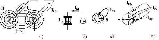Рис. 4.3 – Токи протекающие (Iпр) и токи смещения (Iсм): а) в кабеле; б) в конденцаторе; в) в атмосфере; г) в волноводе.