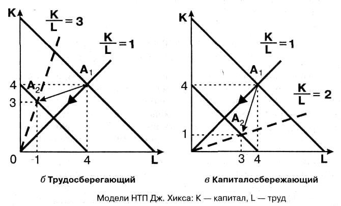 В зависимости от способа учета НТП различают производственные функции с экзогенно и эндогенно заданным технологическим прогрессом. Термин "экзогенно заданный НТП" применяется для обозначения того, что технологический прогресс задается извне, выступает в качестве автономного (по отношению, скажем, к труду и капиталу) фактора производства. Обычно он описывается показательной функцией времени. Когда говорят об эндогенно заданном НТП, имеют в виду, что он находится внутри производственной функции и проявляет себя в изменениях соотношений между факторами, замещении их друг другом.В моделях, где принимается допущение, что приобретение технических знаний зависит только от времени, имеется виду экзогенный технический прогресс. Введение в ПФ множителя, зависящего только от времени, не означает, что время рассматривается в качестве еще одного производственного фактора, а лишь констатирует тренд, причиной которого является НТП.В общем случае ПФ с экзогенным НТП имеет вид: Y=f(K,L,Z), где Z - параметр или вектор параметров, каждое значение которого выражает определенный уровень технического развития. Частным случаем функции является ПФ вида Y=A(t)f(K,L). Здесь множитель A(t) отражает влияние нейтрального по Хиксу технического прогресса. Такой НТП не затрагивает соотношений между факторами (К) и (L) и называется продуктоувеличивающим. Применение моделей с экзогенным НТП коротких интервалах времени. Один из первых подходов к моделированию эндогенного научно-технического прогресса разработан Солоу. Интенсивность использования ресурсов является основным принципом классификации типов экономического роста. Модель Солоу соответствует трудосберегающему НТП: Y = f(K,A(t)L). Общепризнанной является модель технического Хикса. Он рассматривает два фактора экономического роста – труд и капитал, и выделяет три типа НТП: нейтральный, трудосберегающий и капиталосберегающий.Нейтральный НТП основан на таких технологиях, которые одновременно и в равной степени сберегают труд и капитал.При трудосберегающем НТП обеспечивается большая производительность капитала, чем труда. В случае капиталосберегающего НТП в большей степени растет производительность труда, чем капитал.