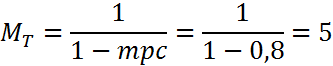 ЗАДАЧА Экономика гипотетической страны характеризуется следующими данными: Фактический доход (У) = 4000 ден. ед. Предельная склонность к потреблению (МРС) = 0,8 Равновесный доход (У*) = 4200 ден. ед. а) Как должны изменяться правительственные расходы (при прочих равных условиях) для того, чтобы экономика достигла равновесного состояния (У* = 4200 ден. ед.)? Решение: Увеличение правительственных расходов вызывает мультипликационное увеличение дохода. Мультипликатор правительственных расходов равен: