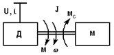 Можно назвать следующие причины возникновения переходных процессов: изменение Мс; изменение М, т. е. переход привода с одной характеристики на другую, имеющий место при пуске, торможении, реверсе, регулировании скорости, изменении какого-либо параметра привода. Необходимость в анализе переходных процессов возникает в связи с тем, что производительность ряда ответственных механизмов (например, реверсивного прокатного стана) определяется быстротой протекания переходных процессов; качество выполнения многих технологических операций определяется переходными процессами (движение лифта, врезание резца в деталь и т. п.); механические и электрические перегрузки оборудования в большинстве случаев определяются переходными процессами. Объектом исследования, как и прежде, будет упрощенная, идеализированная модель привода – (рис. 5.1).
