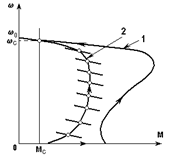 то известен закон изменения во времени w0. 3. Известно начальное (wнач, Мнач) и конечное (wкон, Мкон) состояние привода, момент инерции J и момент сопротивления Мс = const. 4. Преобразователь П обладает двусторонней проводимостью, т. е. характеристики w(М) могут располагаться во всех квадрантах плоскости w, М. Рассмотрим, прежде всего, качественные отличия переходных процессов в системе П-Д от изученных ранее случаев, когда еп или f1 изменялись мгновенно, т. е. мгновенно устанавливалась соответствующая новая механическая характеристика, а изменение скорости w и момента М в переходном процессе происходило согласно именно этой характеристике. Переходный процесс определялся статической механической характеристикой привода. В рассматриваемых далее задачах еп или f1 изменяются, как указывалось, не мгновенно, т. е. переход привода с одной характеристики на другую происходит постепенно, одновременно с изменением скорости, в результате чего соответствие между скоростью w и моментом М в каждый момент времени определяется не статической механической характеристикой, а другой, отличной от нее характеристикой, которую мы далее будем называть динамической механической характеристикой или просто динамической характеристикой. В качестве примера на рис. 4.13 показана статическая характеристика асинхронного двигателя при номинальной частоте 1, по которой будет происходить пуск при мгновенном приложении к двигателю напряжения такой частоты, и динамическая характеристика 2, соответствующая пуску двигателя путем плавного изменения частоты от нуля до номинальной по некоторому закону.