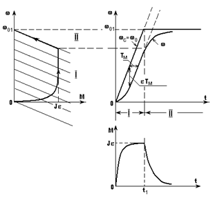 II этап (t > t1). На II этапе wс = w01, а, значит, и еп или f1 имеют постоянную величину. Переходный процесс в этом случае ничем не отличается от рассмотренных ранее переходных процессов, отнесенных к первой группе задач. Если отсчитывать время от t1, (точка 0’), то скорость w и момент М будут изменяться в соответствии с уравнением (4.10); в качестве хнач следует принять значения w и М в момент времени t1. Если t1< 3Тм, начальные значения должны быть определены по (4.19) и (4.20) при подстановке в эти уравнения t = t1. В качестве хкон, очевидно, следует взять w01 и 0. Графики w(t) и M(t) на II этапе показаны на рис. 4.14. Там же слева приведена динамическая механическая характеристка для случая пуска вхолостую. Все рассмотренные выше величины и зависимости имеют очевидный физический смысл для системы П-Д с двигателем постоянного тока. Действительно,
