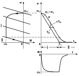 При торможении вхолостую w0 изменяется от значения w01 до нуля. Как и при реверсе, процесс состоит из двух этапов, причем на I этапе (0 < t < t1) кривые w(t) и М(t) не отличаются от аналогичных кривых при реверсе, а на II этапе – подчиняются уравнению (4.10) с соответствующими хнач и хкон. Кривые w(t) и М(t), а также динамическая характеристика показана на рис. 4.16.