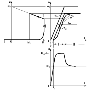 и при t = 0 При t > 3Тм w = e (t - Тм) = wс(t) - e Тм . (4.19, а) Графики wс(t) и w(t) представлены на рис. 4.14. Кривая w(t) сдвинута вправо относительно кривой wс(t) на величину Тм; в каждый момент времени при t > 3Тм разница между wс и w составляет e Тм. Момент в соответствии с (4.20) возрастает по экспоненциальному закону (см. рис. 4.14) и при t > 3Тм достигает величины Mмакс = J e. (5.20, а) Это соотношение позволяет оценить допустимую величину e. Действительно, если считать, что в переходном процессе Ммакс = Мдоп, то