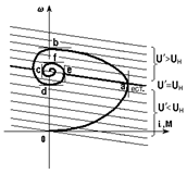 Кривая 0abcd... w0 в плоскости w – M представляет собою динамическую механическую характеристику. Соответствующие зависимости w(t), i(t) или M(t) показаны на рис. 4.20, б. Так как в якорной цепи есть сопротивление Rя процесс перекачивания энергии сопровождается ее рассеиванием, вследствие чего система после ряда колебаний приходит в точку w0, соответствующую установившемуся режиму. Если бы сопротивление Rя было равным нулю, колебания w и М имели бы незатухающий характер. Если, наоборот, Rя велико, энергии, запасенной в Lя на участке 0а, может оказаться недостаточно для покрытия потерь в Rя и вывода якоря в точку w > w0 при i = 0. В этом случае процесс будет иметь апериодический характер. Количественное описание рассмотренных выше процессов можно получить, решив совместно (4.1) и (4.23). Из (4.1) при Мс = 0 следует: