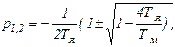 Решение (4.24) найдем в виде w = wсв + wпр = где А1, А2 – постоянные, определяемые по начальным условиям w ½ t=0 и p1, p2 – корни характеристического уравнения 1 + Тмр + ТмТяр2 = 0. (D) Решив (D), получим