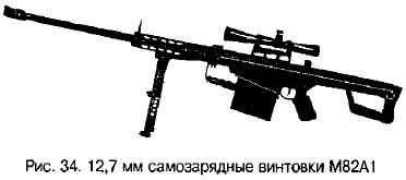 Оптический прицел Unerti кратностью 10х имеет прицельную сетку, позволяющую определять дистанцию до цели. Корпус прицела очень прочный, способный выдерживать самые жесткие условия эксплуатации. Для стрельбы из винтовки применяются штатные снайперские патроны М118 SB. Однако в последнее время снайперы чаще используют специальные патроны М118 Long Range, кучность которых выше снайперских почти в два раза. Интересны некоторые приемы, которыми пользуются американские снайперы при стрельбе. Например, если снайпер, лежа на открытом месте, видит цель, но не может поднять голову, он принимает «позу Хоккинса»: жестко выпрямляет левую руку и обхватывает ремень возле верхней антабки, а нижний угол приклада упирает в землю, прижимая его сверху плечом — из такого положения производится выстрел. Поскольку винтовка М40А1 не имеет сошек, как большинство современных снайперских моделей, то при стрельбе под оружие подкладывает-ся рюкзак, мешочек с песком или импровизированный треножник из веток. Если огонь ведется без упора, используется ружейный ремень. На огневой позиции снайперы заряжают винтовку по одному патрону, так как делают всего один выстрел по цели. Полностью магазин снаряжается при передвижении, из-за возможной встречи с противником. Чтобы не быть обнаруженным противником по блеску гильзы, снайпер приучается открывать затвор большим пальцем правой руки и ловить вылетающую гильзу ладонью. Оптимальной дистанцией для ведения снайперской стрельбы считается 600 ярдов (546 м): обеспечиваются одновременно высокая вероятность поражения цели с первого выстрела и наибольшая безопасность самого стрелка от обнаружения. В некоторых случаях снайперы применяют 12,7 мм самозарядные винтовки М82А1 (рис. 34),