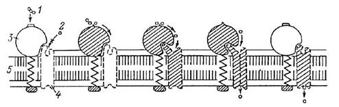 Рис. 1.2. Схема последовательных конформационных взаимодействий ферментной и транспортной частой функционирующего ферментно-транспортного комплекса (по: Уголев, 1985). 1 - субстрат; 2 - продукт; 3 - трансмембранный фермент; 4 - транспортная система; 5 - мембрана. _____________________________