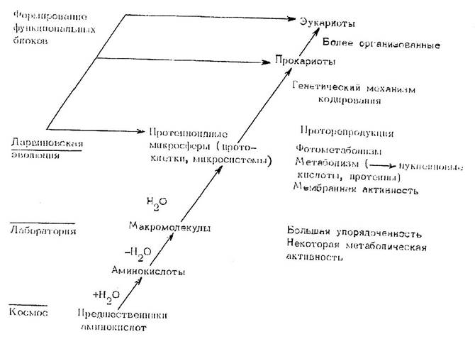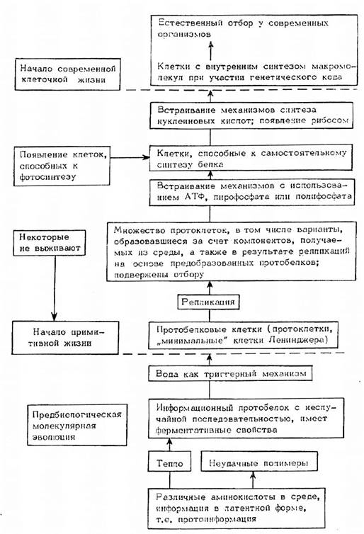 Рис. 9.1. Схема основных этапов молекулярной эволюции и происхождения жизни на Земле (по: Fox, Dose, 1975).