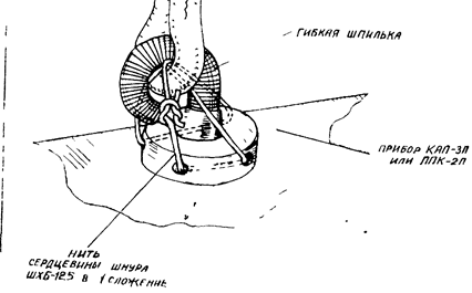 -смонтировать ППК-У-240А па ранце, для чего: -осмотреть прибор, взвести и установить время 2 с, высоту 2000м -законтрить гибкую шпильку сердцевиной шнура ШХБ-125 в одно сложение продев ее через отверстия втулки прибора, ушко гибкой шпильки и петлю фала, а концы нити завязать узлом