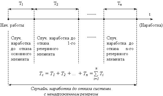 Общий анализ надежности приведен для системы, состоящей из одного основного (рабочего) и (n - 1) резервных элементов. Допущения: 1. Время замены отказавшего элемента резервным равно 0 (t3 2. Переключающее устройство подключения резервного элемента вместо отказавшего основного – абсолютно надежно. При ненагруженном резервировании резервный элемент не может отказать, находясь в отключенном состоянии, и его показатели надежности не изменяются. Исходные данные для расчета надежности: · вероятность безотказной работы (ВБР) i -го элемента Pi(t). · интенсивность отказов (ИО) i -го элемента · математическое ожидание (МО) наработки до отказа i -го элемента T0i. Анализ случайной наработки до отказа системы с ненагруженным резервом (рис. 1):