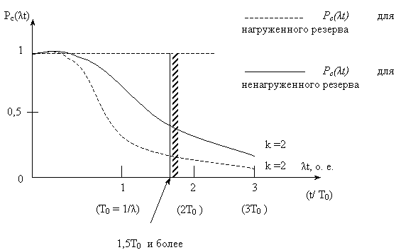 Таким образом, распределение наработки до отказа таких систем подчиняется распределению Эрланга (гамма-распределение при целых n). Согласно, выражению (5) проанализируем, как изменяется ВБР системы при различной кратности резервирования: Сравнение ненагруженного и нагруженного резервирований проведено по графику Pс(