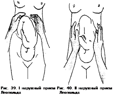 Наружное акушерское обследование проводят с помощью четырех приемов Леопольда. Первый наружный прием (рис. 39). Акушер садится справа от беременной, лицом к ней. Ладонные поверхности рук кладет на дно матки, пробует свести между собой ногтевые фаланги пальцев. Благодаря этому приему определяют высоту стояния (срок беременности) и форму дна матки (нормальная, седловид- ная, двурогая), часть плода, находящуюся на ее дне (если здесь широкая, мягкая часть - ягодички, то предлежание головное или, наоборот, на дне матки расположена маленькая, твердая часть — головка, то предлежание тазовое). Если пальцы сходятся между собой но центру дна матки - продольное положение плода, сбо- ку от средней линии — косое, не сходятся совсем и дно матки расположено ниже пупка — поперечное положение. Второй наружный прием (рис. 40). Врач опускает обе руки со дна матки на боковые стенки живота и поочередно то одной, то второй рукой, осуществляет пальпацию. Если определяет на одной стороне гладкую, широкую, выгнутую поверхность — спинку (слева — первая позиция, справа — вторая позиция), ко- торая повернута кпереди (передний вид) или кзади (задний вид), а на противоположной стороне определяются мелкие подвиж- ные бугры, то это значит, что членорасположение правильное, плод живой. Если ладони обеих рук размещены параллельно и близко одна к другой, — продольное положение, косо — косое положение, далеко одна от другой и ниже пупка — поперечное положение, спинка или затылок головки слева - I позиция или справа — II позиция, спинка повернута кпереди - передний вид