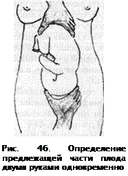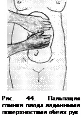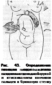 тирование), после этого быстро возвращается на прежнее место и иногда передает толчок правой руке (двойное баллотирование). Если предлежащая часть прижата ко входу в малый тазло паль- цы обеих рук после применения небольшого усилия сходятся под ней, а возвращаясь назад, — расходятся. Если предлежащая часть вставилась малым сегментом в плоскость входа в малый таз, то пальцы, продвигаясь книзу, сходятся, но полностью сойтись уже не могут из-за фиксированной небольнюй части головки, а воз- вращаясь назад, — расходятся.) Если головка, вставилась боль- шим сегментом в плоскость входа в малый таз, руки при продви- жении вниз расходятся, а возвращаясь назад, "сходятся. Если головка находится высоко над входом, прижата к входу или вста- вилась малым сегментом в плоскость входа, можно получить представление о размерах головки, о месте размещения затылка и лица плода. Например, затылок повернут влево и вперед — I позиция, передний вид; лицо влево и вперед - II позиция, зад- ний вид. Кроме этого, благодаря четвертому приему можно оп- ределить налпчне угла между затылком и сцинкой плода, на ос- новании чего можно заподозрить лицевое вставление головки в плоскость входа в малый таз. В тех случаях, когда определить позицию плода точно невоз- можно, используют следующие дополнительные приемы: 1) одной рукой нажимают на дно матки, чтобы спинка пло- да сильнее согнулась, а второй рукой осуществляют пальпацию (рис. 43); 2) осторожно втискивают концы пальцев обеих рук в боко- вые поверхности живота — сопротивление значительно больше там, где находится спинка плода, и меньше — со стороны мелких частей плода (рис. 44); 3) одной рукой охватывают дно и боковую стенку матки, а концы четырех пальцев другой руки втискивают в живот с про- тивоположной стороны: со стороны спинки плода чувствуется большее сопротивление передней брюшной стенки, чем в том ме- сте, где размещены конечности (рис. 45); 4) для улучшения пальпации спинки плода вторым при- емом наружного акушерского исследования ассистент продви- гает руку за матку и отодвигает ее к передней брюшной стенке; 5) для проведения сравнительной оценки и уточнения пред- лежания плода мы проводим третий прием наружного акушерс-