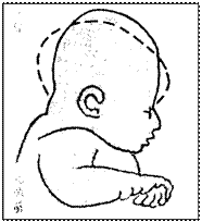 реносьем (или границей волосис- \ той части лба) в нижний край сим- физаГобразует первую точку фик- сации. После этого головка начина- ет сгибаться в шейной части позво- ночника до тех пор, пока из поло- вой щели первым не появится ма- лый родничок, а затем над промеж- ностью выкатывается затылок. IV момент: разгибание головки (рис. 116). Головка затылочным буг- ром или подзатылочной ямкой ка- сается верхушки копчика, разгиба- ет его, упирается в крестцово-копчи- ковое сочленение, образуя вторую точку фиксации. После этого голов- ка разгибается своим прямым раз- мером через прямой размер плоско- сти выхода из малого таза. Благода- ря этому движению над промежно- стью появляется лоб, рот и подборо- док, чем, собственно, оканчивается рождение головки. Родовая опухоль на головке размещается в области Рис. 117. Переднеголовное большого родничка. Головка умень- вставление. Брахиоцефали- шенав прямом и лобно-затылочном ческая форма головки размере, вытянута кверху теменным участком, имеет вид высокой баш- ни или брахиоцефалическую форму (рис. 117). V момент: внутренний поворот плечиков и наружный пово- рот головки. Плечики своим биакромиальным размером (12 см) вставляются в поперечный размер плоскости входа в малый таз через сужение прямого размера. Плечики продвигаются и при переходе из широкой части малого таза g, узкую начинается их внутренний поворот, который заканчивается на тазовом дне. Вс- ледствие этого поворота плечики стают в прямой размер плос- кости выхода из малого таза. 1Этот поворот плечиков передается головке, которая оборачивается затылком к бедру матери, соот- Разгибателъпые вставления головки плода ветственно позиции плода. Туловище плода рождается, как при заднем виде затылочного вставления головки плода.