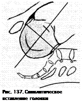 ниже и ниже и становится ведущей точкой. В зависимости от величи- ны сужения таза возникает разги- бание головки различной степени: при незначительном уменьшении истинной конъюгаты — I степень разгибания (переднеголовное вставление, которое наблюдается чаще всего), при средней степени