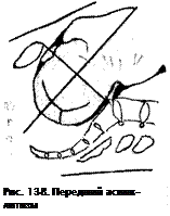 вставление) и при значительном уменьшении истинной конъюгаты — III степень разгибания (лицевое вставление). II момент — асинклитическое вставление головки плода. Если го- ловка, разогнувшись, не может пройти через уменьшенный прямой размер плоскости входа в малый Рис. 136. Принцип вставле- таз, то она начинает продвигаться ния эллипсоидного тело в частями. Из рис. 136 видно, что эл- трубку меньшего диаметра липсоидное тело, имеющее диаметр (по Зельгейму) больше, чем просвет трубки, может вставиться и войти в нее лишь тогда, когда оно поделится на две равные части и войдет в трубку косо по частям (по Зельгейму). Из этого рисунка следует, что когда головка должна пройти че- рез уменьшенную прямую конъюгату, она входит в малый таз не синклитически, то есть равномерно и одновременно обоими те- менными буграми (рис. 137), а асинклитически — так, что одна теменная косточка будет первой постепенно опускаться вниз, прикрывая вход второй, которая остается над входом в малый таз. Если в плоскость входа в малый таз первой вставляется пе- редняя теменная косточка, то это передний асинклитизм или от- клонение Негеля (рис. 138). При вставлении первой задней те- менной косточки — это задний асинклитизм или отклонение Лит- цманна (рис. 139). В зависимости от того, какая теменная кос- точка вставляется в плоскость входа в малый таз первой, стрело- видный шов может проходить возле мыса или симфиза. От чего зависит возникновение переднего или заднего асинклитиз- ма? Передний асинклитизм чаще встречается у повторно родящих беременных с перерастянутыми мышцами передней брюшной стен- ки, большим углом наклона таза, высоким стоянием и горизонталь- ным выступанием мыса (промон- ториума) в просвет газа, когда зад- ний теменной бугор упирается в него, фиксируется и остается там до тех пор, пока в малый таз полно- стью не опустится передняя темен- ная косточка. При переднем асин- клитизме опустившаяся головка в дальнейшем не ощущает преград в полости малого таза, поскольку она располагается в крестцовой впади- не, а переднее плечико упирается в переднюю брюшную стенку и тоже не встречает противодействия. В связи с этим считают, что передний асинклитизм более благоприятен для рожениц и рождения живого малотравмированного ребенка. Задний асинклитизм чаще воз- никает у первородящих с упругой брюшной стенкой, малым углом наклона таза, низким стоянием кре- стцовой кости и пологим выступа- нием мыса. При этих особенностях таза головка отходит вперед, будто сползает с промонториума, упира- ясь передней теменной косточкой в симфиз. При наружном акушерс- ком исследовании, в связи с тем, что передняя теменная косточка стоит над симфизом, можно уста- Рис. 138. Передний асинк- литизм Рис. 139. Задний асинкли- тизм Рис. 137. Синклитическое