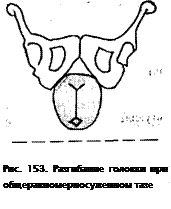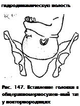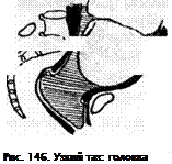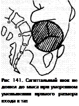ковом сочленении и головка не может разогнуться. Ошибку вра- чей можно исправить двумя способами: 1) если плод живой, ло- мается крестцово-копчиковое сочленение; 2) при интранаталыюй гибели ребенка проводится плодоразрушающая операция (крани- отомия). VI момент - внутренний поворот плечиков и наружный по- ворот головки плода происходят, как при простом плоском тазе. У новорожденного можно увидеть резкую конфигурацию голов- ки: смещение теменных косточек одна на другую, на одной те- менной косточке определяется большая родовоя опухоль, а на другой - углубление (различной формы) вследствие длитель- ного прижатия черепа к мысу или симфизу (рис. 143, 144). 4. Тоз с уменьшением прямого розмеро широкой чости полости молого тозо Таз с уменьшением прямого размера широкой части полости малого таза характеризуется уплощением крестца до исчезнове- ния крестцового углубления, увеличением его длины, уменьше- нием прямого размера широкой части полости таза, отсутствием разницы между прямыми размерами входа, широкой и узкой ча- стей. Различают две степени сужения: I - прямой размер колеб- лется от 12,5 до 11,5 см; II - менее чем 11,5 см. Информативным признаком этого вида патологии является уменьшение лобково- крестцового размера (расстояние от середины внешней поверх- ности симфиза до места сочленения V поясничного и I крестцо- вого позвонков). В норме этот размер равен 21,8 см, при незна- чительном сужении широкой части полости таза он уменьшает- ся до 20,5 см, а при резком сужении таза составляет 19,3 см. Биомеханизм родов при уменьшении прямого размера ши- рокой части полости малого таза происходит аналогично тому, как при простом плоском тазе. 5. Общеровномерносуженный тоз Общеравномерносуженный таз (см. рис. 130, 4) встречается у 8% случаев всех узких тазов. Этот вид патологии наблюдается у женщин невысокого роста (150 см и ниже), правильного те- лосложения, с тонкими костями, недостаточно развитыми наруж- ными и внутренними половыми органами, незначительно выра- женными молочными железами, скудной волосистостью на лоб- ке. Для этого таза характерным является равномерное уменьше- ние всех размеров и узкая лобковая дуга с острым лонным уг- лом. При наружном акушерском исследовании можно устано- вить, что все размеры газа и крестцового ромба равномерно уменьшены. При влагалищном исследовании в начале родов головка сто- ит высоко, отсутствует деление вод на передние и задние, не об- разуется гидродинамическая полость (рис. 145, 146), сагитталь- ный шов - в поперечном или косом размере плоскости входа в малый таз, малый родничок - в центре таза. Биомеханизм родов при общеравномерносуженном (инфан- тильном, карликовом) тазе состоит из 4 моментов: