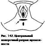 Рис. 140. Сагиттальный шов 111 момент - внутренний пово- у мыса при значительном рот головки плода чаще всего пре- уменьшении прямого разме- исходит на тазовом дне. Это связа- ра входа в таз но с увеличением прямых размеров широкой и узкой плоскостей таза за счет отклонения крестца кзади. Го- ловка, простояв в плоскости входа в . малый таз и приспособившись к (J f j уменьшенным своим прямым разме- рам, очень быстро проходит широ- кую и узкую части таза, опускается на тазовое дно, где и происходит ее внутренний поворот затылком к кре- стцу. Очень редко (у женщин в сто- Рис 141. Сагиттальный шов ячем положении) небольшая голов- не дошел до мыса при уме- не сделав внутреннего поворота, проваливается на тазовое дно, вызы- вает не продольный (как обычно), а "центральный" или поперечный раз- рыв промежности (рис. 142). IV момент — сгибание головки плода происходит, как при простом плоском тазе. V момент - разгибание головки плода чаще всего происходит, как при простом плоском тазе, за исклю- Рис. 142. Центральный или ч е н и е м т е х случаев, когда отсутству- поперечный разрыв промеж- ет п о д в и ж н о с т ь в Крестцово-копчи- ности ренном уменьшении прямо- го размера входа в таз