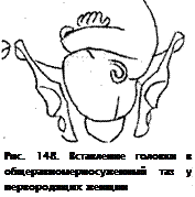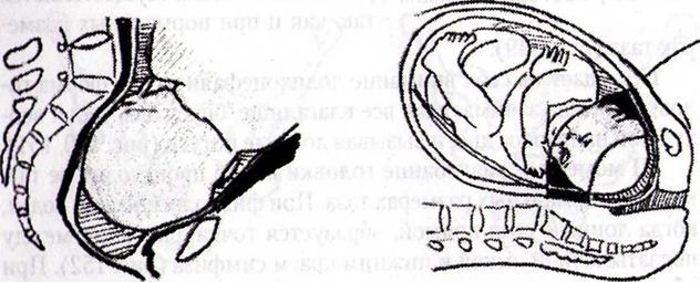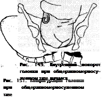 Рис. 146. Узкий таз: головка Таз происходит максимальное сги- стоит высоко, не разделяет бание головки до малого косого ВОДЬ! на передние и задние, P A 3 M E P A I м а л ы й родничок опуска- не образует функциональную е т с я к первым, занимает цент- гидродинамическую полость, ральное положение (асинклитизм Редерера) или даже на проводной оси таза (рис. 148). Чем меньше размеры таза и чем длительнее вставление головки в плоскость входа в малый таз, тем более выра- жено изменение формы головки плода. В некоторых случаях родо- вая опухоль головки опускается на тазовое дно, а череп еще находится Рис. 147. Вставление голов- в плоскости входа в малый таз. ки в общеравномерносужен- 11 момент - внутренний пово- ный таз у повторнородящих Р<>т головки плода осуществляется так, как и при нормальных разме- рах таза (рис. 149). Обращает на себя внимание долихоцефалическая форма го- ловки, иногда занимающая все влагалище, опускаясь своей вер- хушкой на тазовое дно, и вызывая ложные потуги (рис. 150,151). III момент — разгибание головки плода происходит не так, как при нормальных размерах таза. При физиологических родах, когда лонный угол прямой, образуется точка фиксации между подзатылочной ямкой и нижним краем симфиза (рис. 152). При общеравномерносуженном тазе лонный угол острый и возника- ет две точки фиксации, вокруг которых и происходит разгиба- ние головки, вследствие чего она отодвигается кзади, повышает давление на промежность и вызывает ее разрывы, (рис. 153). Узкий таз первородящих женщин Рис. 150. Конфигурация голов- ки при нормальном тазе Рис. 152. Разгибание головки при нормальном тазе Рис. 149. Внутренний поворот головки при общеравномерносу- женном тазе начался Рис. 151. Конфигурация голов- ки при общеравномерносужен- ном тазе Рис. 153. Разгибание головки при общеравномерносуженном тазе Слишком согнутая головка, врезываясь и прорезываясь, разги- бается дольше, чем это бывает при нормальных размерах таза, когда она согнута незначительно. Несмотря на то что головка рождается в состоянии максимального сгибания и конфигура- ции, травматизм родовых путей большой, поэтому лучше сделать центрально-латеральную правостороннюю эпизиотомию. IV момент — внутренний поворот плечиков и наружный пово- рот головки плода происходят, как при нормальных размерах таза. Мсф^-^щ^^плоский тш Все размеры общесуженного плоского таза уменьшенные и особенно прямые. Такой таз имеет признаки общеравномерно- суженного и простого плоского таза. Поэтому биомеханизм ро- дов проходит в зависимости от того, признаки какого таза пре- обладают: по типу простого плоского или общеравномерносужен- ного. Головка своим стреловидным швом вставляется в попереч- ный размер плоскости входа в малый таз. При сильном сужении таза происходит асинклитическое вставление и конфигурация головки, как при простом плоском тазе. Прорезывается головка по типу общеравномерносуженного таза с большой травматиза- цией черепа, промежности и прямой кишки. Date: 2015-08-06; view: 1319; Нарушение авторских прав |