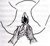 ции (только сгибается указательный палец) (рис. 175); 2) правую руку кладут сверху на концы рукоятки под левой рукой (рис. 176); 3) правая рука находится на замке и крючках Буша, левая - сверху на рукоятках (рис. 177). Независимо от того, какая рука захватывает рукоятки, основ- ной извлекающей силой являются II, III, IV пальцы руки, распо- ложенной на замке и крючках Буша. Рабочие тракции осуществляют согласно биомеханизму ро- дов. Извлечение головки плода начинают со слабой тракции, которая постепенно усиливается, доводится до максимума и дер- жится в течение 20-30 с, после этого опять постепенно ослабе- вает (в сумме составляет до 2 - 3 мин). Тракции должны прово- диться с паузами от 30 до 60 с. После 4 - 5 тракций кисть руки, сжимающая рукоятки, расслабляется на 1-2 мин для того, что- бы немножко разомкнулись щипцы, отдохнула роженица и во- зобновилось нормальное кровообращение в головке плода. При проведении пробной и рабочих тракций (особенно в конце опе- рации) необходимо, чтобы "ось щипцов, ось головки и ось таза совпадали", стреловидный шов находился посредине между лож- ками, ведущая точка головки (малый родничок) должна нахо- диться в плоскости ветвей и около замков щипцов (рис. 178). Тракции проводятся только в одном направлении в зависимос- ти от размещения ведущей точки и тенденции изменения ее по- ложения. После прорезывания затылка перед оператором возникает вопрос: что делать дальше? Вытягивать головку щипцами или