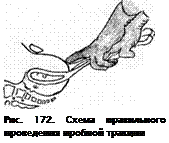 Рис. 172. Схема правильного проведения пробной тракции Рис. 173. Неправильное про- ведение пробной тракции водится в том направлении, в котором находятся рукоятки пос- ле замыкания ветвей щипцов, придерживаясь третьего тройного правила (трех "О"): "ось щипцов, ось головки и ось таза должны совпадать". При соскальзывании щипцов с головки плода указа- тельный палец левой руки постепенно или быстро отдаляется от черепа, расстояние между замком щипцов и головкой плода уве- личивается, рукоятки начинают расходиться. В таких случаях пробную тракцию необходимо прекратить, снять щипцы и ввес- ти ложки снова. Если ложки введены и размещены правильно, а рукоятки замкнуты, то во время пробной тракции головка плода продвигается за щипцами и кончик указательного пальца левой руки все время касается черепа плода. IV момент — рабочие тракции извлечения головки. После того как акушер во время пробной тракции убедился в правиль- ности наложения щипцов, приступают к проведению рабочих тракций. Правая рука продолжает удерживать щипцы так, как это было во время пробной тракции. Усиление вытягивания го- ловки плода левой рукой возможно в трех положениях: 1) левую руку кладут на правую так, как при пробной трак- Рис. 1 74. Пробная тракция (по Деде рл ей ну) Рис. 1 75. Рабочая тракция. Ле- вая рука размещена сверху на правой руке (по И.Ф. Жорданиа)
