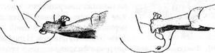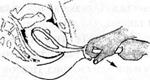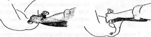 — исключается возможность использования большой силы при тракциях; — головка удерживается и сжимается в щипцах под опреде- ленным и неизменным давлением на протяжении всей операции; — благодаря перемещению точек прикладывания силы в щипцах от замка к головке облегчается влияние на последнюю в желаемом и необходимом направлении; — пальцы акушера, размещаясь над и под щипцами, действу- ют одновременно в разных направлениях, обеспечивая выпол- нение тракций по проводной оси родовых путей; — при тракциях головка легче отводится от лобковых кос- тей по направлению к крестцу, чем облегчается сведение ее вниз и выведение черепа; — предплечья оператора, находясь под щипцами, замещают со- бой сложные рычага французских щипцов с осевыми тракциями. Критерием правильного сведения и выведения головки щип- цами служат: — положение малого родничка (ведущая точка) по отноше- нию к продольной оси наложенных щипцов; — расстояние между малым родничком и нижним краем лон- ного сочленения не должно быть меньше 3-4 см; — характерны изменения, наступающие в самом заднепро- ходном отверстии и в окружающем его участке промежности. Техника наложения акушерских щипцов и извлечения го- ловки по методу Н.А. Цовьянова состоит из 5 моментов: 1. Введение и размещение ложек щипцов. 2. Замыкание ветвей щипцов. 3. Захват щипцов. 4. Рабочие тракции извлечения головки. 5. Снятие щипцов. I момент — введение и размещение ложек и II момент — за- мыкание ветвей щипцов выполняются таким же образом, как при наложении обыкновенных щипцов. III момент — захват щипцов начинают с того, что указатель- ным и средним пальцами обеих рук захватывают боковые повер- хности обеих рукояток таким образом, чтобы между ними раз- мещались крючки Буша (рис. 198). Упомянутые пальцы пере- плетаются между собой и сгибаются в виде крючков вокруг ру-