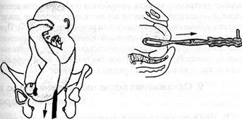 ции. Направление их аналогично тем, которые проводятся пальцем при экстракции плода. После нача- ла прорезывания ягодичек плода крючок немедленно снимается и дальнейшие тракции проводятся двумя пальцами. Для извле- чения мертвого ребенка Г.Г. Гентер и некоторые авторы совету- ют использовать краниокласт, вводя сплошную внутреннюю ложку в задний проход плода, а окончатую браншу накладыва- Рис. 251. Тупой крючок для вытягивания плода Акушерские операции при тазовых вставлнпиях Рис. 252. Извлечение плода при Рис. 253. Наложение краниок- ют на область крестца (рис. 253). Для ускорения рождения пло- да мы используем несколько пулевых щипцов или щипцов Мюзо, которые накладываем на ягодички мертвого плода. Она состоит из шести этапов: первый - ожидают спонтанно- го рождения плода до пупка, обматывают его теплой влажной пе- ленкой, охватывают туловище сверху и снизу обеими руками (рис. 254); второй - два больших пальца размещают по бокам позвоночника, а остальными пальцами обеих рук акушер под- держивает животик плода, деликатной и осторожной тракцией способствуют его рождению до нижнего угла лопаток; третий - туловище плода осторожно поворачивают и подтягивают так, чтобы плечико подошло под симфиз; четвертый - акушер своей рукой, расположенной вверху, освобождает из под лонного со- членения ручку плода. Для этого рукой он достигает локтевого сгиба и стягивает ручку вниз по грудной клетке; пятый - пово- рачивая туловище плода на 180°, переводят плечико из заднего положения в переднее (под симфизом) и аналогично предыду- щей ручке освобождает вторую ручку плода. Во время этих ма- нипуляций акушер своей рукой отводит туловище плода книзу; шестой - если головка плода спонтанно не рождается, оператор кладет два пальца на околоносовую поверхность, осторожно на- помощи тупого крючка (по