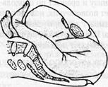 ности для создания условий дальнейшего удаления внутреннос- тей, расчленения плода и его извлечения по частям через есте- ственные родовые пути. Показания для экзартику- ляции плода: — запущенное поперечное по- ложение плода (рис. 353) с выпа- дением ручки через общеравно- мерносуженный или воронкооб- разный таз, когда невозможно вве-