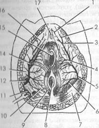 малого таза через боль- шое седалищное отвер- стие ниже грушевидной мышцы, огибает сзади седалищную ость и на- правляется вперед и ме- диально, возвращается в полость малого таза че- рез малое седалищное от- кишечной ямки. Под се- чатку седалищно-прямо- Половые органы женщины получают кровь (рис. 12) из двух источников: 1) подчревной (внутренней подвздошной) артерии (a. hipogastrica s. a. iliaca interna)] 2) яичниковой (внутренней семенной) артерии (a. ovarica s. a. spermatica interna). Брюшная аорта на уровне IV поясничного позвонка делится на две (левую и правую) общие подвздошные артерии (а.а. iliacae communes). Обе общие артерии направляются наружу и вниз по внутренне- му краю большой поясничной мышцы. В области крестцово-под- вздошного сочленения общая подвздошная артерия (a. iliaca communis) делится на два сосуда: наружную подвздошную арте- рию (a. iliaca externa), которая толще, и внутреннюю ПОДВЗДОШ- НУЮ артерию (a. iliaca interna) или подчревную артерию (а. Рис. 12. Артериальная система внутренних женских половых орга- нов (вид сзади, по В.П. Воробьеву). 1. Uterus', 2. Ramus ascendens; 3. Tuba uterina; 4. Ovaria; 5. Ramus tubarius a. uterina; 6. Ramus ovaricus a. uterina; 7. A. ovarica; 8. A. iliaca interna; 9. A. umbilicalis; 10. A. obturatoria; 11. A. uterina; 12. A. pudenda interna; 13. A. rectalis; 14. Vagina; 15. Rectum; 16. A.recta/is inferior, 17. M.obturatorius internus; 18. A. vaginalis', 19. Ureter, 20. A. glutea inferior, 21. A. glutea superior, 22. A. iliaca externa; 23. M.psoas major, 24. A. iliaca interna; 25. A. iliaca communis; 26. M. iliacus Анатомия и физиология жепских половых органов hipogastric а). Последняя спускается вниз по заднебоковой стен- ке полости малого таза и, достигнув верхнего края foramen /м hiadicum majus, делится на переднюю и заднюю ветви. ()т передней ветви подчревной артерии отходят: внутренняя (| мм пая артерия (a. pudenda interna), маточная артерия (а. himna), пупковая артерия (а. umbilicalis), нижняя артерия мо- к ш и оиузыря (а. vesicalis inferior), средняя артерия прямой киш- ки (a haemonhoidalis media), нижняя седалищная артерия (а. i'liiiaca inferior). От задней ветви (a. hipogastrica) отходят следу- 1ИЩЦС артерии: подвздошно-поясничная (a. iliolumbalis), боковая крг< гцомая (a. sacralis lateralis), запирательная (a. obturatoria), glutaea superior), осуще- ствляющие кровоснаб- жение стенок и мышц ма- лого таза. Из сосудов, отходя- щих от внутренней под- вздошной артерии (рис. 13), клиническое значе- ние имеют следующие: внутренняя срамная ар- терия (а. pudenda interna) отходит от пере- дней ветви подчревной артерии, идет вниз и на- ружу, оставляя полость малого таза через боль- шое седалищное отвер- стие промежности (по Р.Д. стие ниже грушевидной ининмт*»'»ау) I Л dorsalis clitoridis I Д iih^lunJii I htoridis; 3. A. clitoridis мышцы, огибает сзади седалищную ость и на- правляется вперед и медиально, возвращается в полость малого таза через малое седалищное от верстие, входит в клет- чатку седалищно-прямокишечной ямки. Под се- далищным бугром от нее отходят 2 -3 ветви нижней артерии пря- мой кишки (а. a. haemorrhoidales inferiores). Затем основной ствол внутренней срамной артерии достигает заднего края diaphragma urogenitale, где разделяется на две конечные ветви: a. perinei et а. clitoridis. Артерия промежности (a. perinei s. a. perinealis) прохо- дит над т. transversus perinei superficialis, поднимается вверх по ходу т. ischiocavernosus, отдавая веточки к задней поверхности срамных губ (a. a. labiales posteriores) и мышц переднего отдела промежности. Артерия клитора (a. clitoridis) проходит под т. transversus perinei superficialis, поднимаясь вверх по т. transversus perinei prof undus, отдавая в середину этой мышцы артерию луко- вицы преддверия (a. buibi vestibule vaginae) и артерию мочеис- пускательного канала (a. urethral is), углубляется в промежуток между т. isclioccavemosus и т. bulbocavernous, подходит 